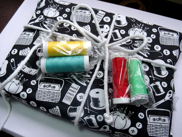 Tudo aqui é presente! Independente do que for colocado dentro deste pacote, para uma costureira a embalagem também é presente: no lugar do papel, tecido com estampa do ofício; em vez de fita, cordão de algodão; fazendo as vezes de laço, saquinho transparente com quatro retrozes de linha colorida. Gostou? Veja mais aqui.Um moranguinho fechando uma caixa de presente! E feito de croché! Eu ganhei este da Ana Menina, há alguns anos, junto com as cerejinhas e berinjelas das fotos abaixo. O trabalho dela é lindo, delicado, e casou com perfeição com a fita de camurça preta para fechar uma caixinha de presente. Com as cerejas, coloquei fita de camurça vermelha. E com as berinjelas, cordões de algodão em dois tons: roxo e lilás. Leia mais aqui.